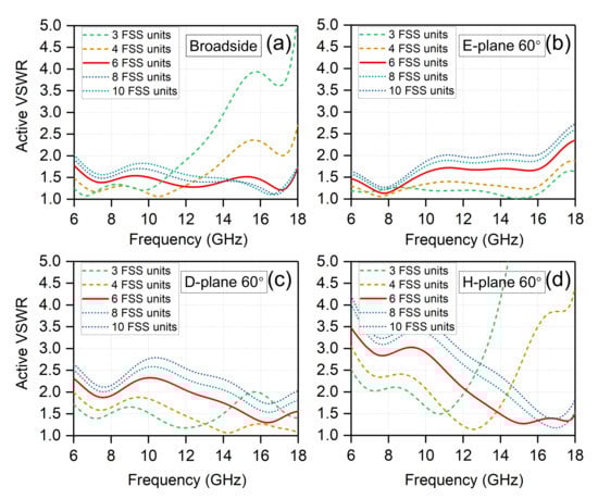 An FSS is a periodic structure, which is basically an assembly of identical elements arranged in a one or two-dimensional array. In our case, the total number of the FSS units in a 8 × 8 antenna array is 48 × 48, which are as a superstrate shared by all the antenna elements, as shown in Figure 1a. There are six FSS units in one antenna unit cell. The width of the FSS unit is much less than , about , thus the FSS superstrate always operates below its resonance frequency in the whole band. The antenna unit cell with different numbers of FSS units were simulated. The gaps between the FSS units remained unchanged. Figure 8 shows the impacts of the number of FSS units on the active VSWR when scanning in different planes. As shown in Figure 8, when the number of the FSS units decreases from 6 to 3 or 4, the active VSWR gets better when scanning to 60 in the E-/D-planes, but the active VSWR deteriorates seriously when scanning to broadside and 60 in the H-plane at high frequencies. The width of the FSS unit will increase as the number decreases, approaching , thus this will affect the high-frequency performance first. Therefore, the number of FSS units should not be too small. When the number of the FSS units increases from 6 to 8 or 10, the active VSWR gets worse slightly. It should be noted that increasing the number may achieve the same good performance when some optimizations are carried out. However, this will result in many small metallic sheets, which is undesired during machining process.