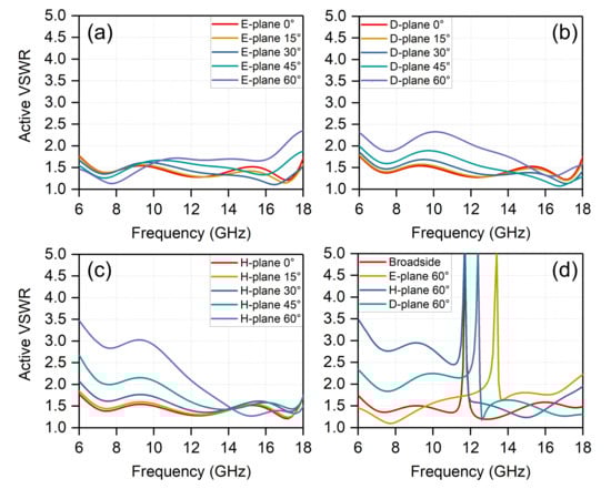 As shown in Figure 9a–c, the active VSWR of the proposed infinite array maintains <2.5 when scanning up to 60 in the E-/D-planes, and maintains <3.5 when scanning up to 60 in the H-plane across the entire 3:1 frequency band. The impedance matching for beam scanning in the E-plane is better than that in the H-plane, and the D-plane results follow an approximate average of the E- and H-planes.