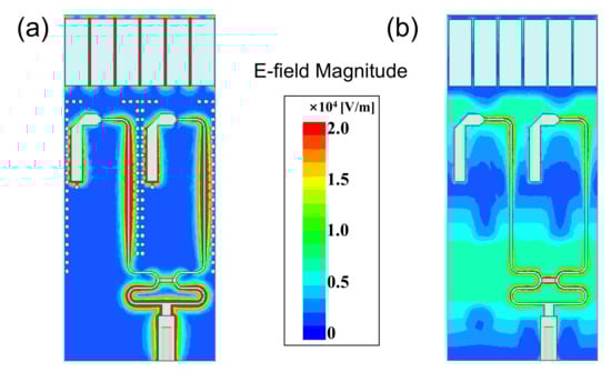 Simulated E-Field magnitude distribution of the proposed array at 11.7 GHz when scanning to broadside. (a) With plated-through vias (non-resonance); (b) Without plated-through vias (resonance).