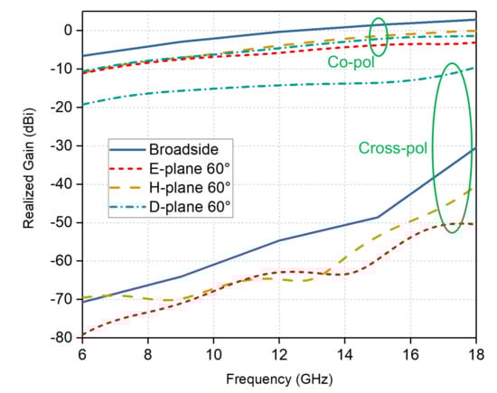 Figure 11 plots the simulated co-polarization and cross-polarization level per unit cell of the infinite array for scanning to broadside and 60 in all planes. The co-polarized gain gradually increases with frequency and decreases with scanning angle. For 60 scanning in the H-/D-planes, the co-polarized gain is about 3.5dB lower than that of broadside across the entire frequency band. It can be seen that the scan loss at high-frequency band in the E-plane is a little higher but within acceptable limits. The cross-polarization performance of the design is superior, which is one more benefit of the parallel dipoles. The cross-polarization is defined following Ludwig’s third definition []. The simulated cross-polarization is at least {−33 dB, −47 dB, −40 dB} lower than the co-polarization at {broadside, E-plane 60, H-plane 60}, respectively. Compared with the typical single-dipole TCDA, which has −20 dB cross-polarization level at broadside and when scanning in principal planes, the parallel-dipole design has a significant improvement. Here the proposed array employs the similar cross-polarization suppression mechanism with the balanced antipodal Vivaldi antenna [,], but with better cross-polarization performance due to more symmetrical structure. The strong transverse E-field components () perpendicular to the dipole arms, which is usually occurred in a conventional single-layered dipole array, can be counteracted due to the double-sided radiating structures, thus leading to better cross-polarization characteristics, as shown in the top view in Figure 4b. It is worth noting that the cross-polarization suppression mechanism is more effective in the principal planes. While the D-plane cross-polarization levels keep well, remaining below −8.5 dB at 60 over the whole frequency band. This generally agrees with the ideal linearly polarized dipole apertures where the cross-polarization level is −9.5 dB at 60 [].