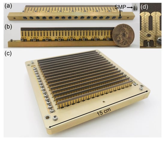 After indication of good performance in an infinite array environment, a 16 × 16 prototype array was fabricated and measured. As depicted in Figure 12, its overall dimensions are . The module design is adopted to make maintenance easy. The array includes 16 vertically placed PCBs, and each is screwed to a strip metal base. The upper ground plane contains a series of slots, and thus each board can be inserted vertically from the back of the metal framework. Two locating pins on the edges of the strip metal base are used to ensure the proper spacing between the boards. The antenna elements are fed by the SMP connectors embedded in the strip metal base. It should be noted that some of the plate-through vias are removed for the convenience of machining, as shown in Figure 12d, which does not affect the desired performance of the array.