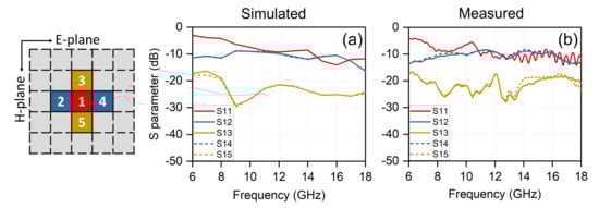 where () is the array scan direction, is the s-parameter between the element and , is free-space wavenumber, are the number of elements, are the lattice spacings in the E- and H-planes, respectively. To gain insight to the coupling results between the unit cells of this kind of tightly coupled array, Figure 13 plots the simulated and measured reflection and transmission coefficients of the central port with four adjacent ports. The curves of and coincide perfectly, and the same is true for and curves, which are due to the symmetry of the array. The trends of simulated and measured results show a good consistency, excepted for some valleys in the measured curves. Machining and measurement errors may lead to this phenomenon. The red curves represent the reflection coefficients . We can find that the amplitudes of S11 are higher than −10 dB in the low band, while the active VSWR is good at broadside (see Figure 9). This just indicates the operating principle of tightly coupled arrays, which is working by using the strong mutual coupling between units, especially for the low frequencies. The yellow curves represent the transmission coefficients and , which indicate the inter-element coupling in the H-plane. The blue curves indicate the inter-element coupling in the E-plane. It can be seen that the E-plane coupling is stronger than that of H-plane. As it is well known that the coupling strengths decrease as the distance increases, the coupling results with other ports are not shown.