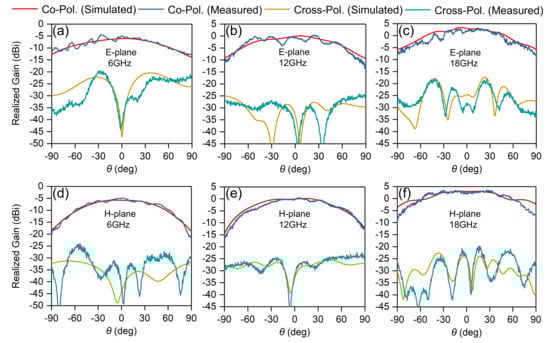 Comparisons of measured and simulated embedded element patterns for the central element (8, 8) of the proposed array. (a) E-plane @ 6 GHz; (b) E-plane @ 12 GHz; (c) E-plane @ 18 GHz; (d) H-plane @ 6 GHz; (e) H-plane @ 12 GHz; (f) H-plane @ 18 GHz.