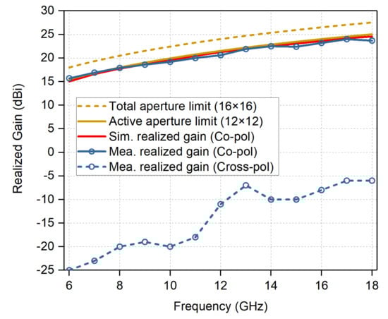Of particular interest is the fully excited array scanning patterns. The measurement was conducted following the unit excitation active element pattern method []. The active part of the aperture was chosen to be 12 × 12, with edge elements terminated with matched loads to mitigate edge reflection effect. The measured and simulated broadside gains versus frequency are plotted in Figure 16, along with the theoretical gain limits for the active aperture and the total aperture. The ideal aperture limit is calculated using 4A/, where A is the aperture area, and is the wavelength in free space. The dashed yellow curve is the total aperture limit of the 16 × 16 array. The solid yellow curve is the active aperture limit of the active 12 × 12 array within the 16 × 16 array. The red curve is the simulated broadside gain of the active 12 × 12 aperture. As can be seen, the simulated and measured data agree well for the whole frequency band. The measured co-polarized gains are very close to the active aperture limits, which indicates a high aperture efficiency. The measured broadside cross-polarized gains of the array remain at least 29 dB lower than the co-polarized gains within the operation band. The measured results are a little higher than the simulated cross-polarization level, probably resulting from the measurement precision limit of the anechoic chamber and the misalignments of the array and the feeding antenna.