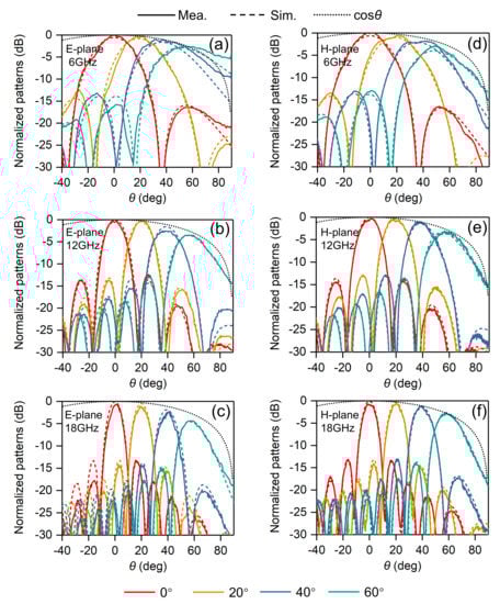 Measured and simulated normalized radiation patterns for 0, 20, 40, and 60 scans in the principal planes. (a) E-plane @ 6 GHz; (b) E-plane @ 12 GHz; (c) E-plane @ 18 GHz; (d) H-plane @ 6 GHz; (e) H-plane @ 12 GHz; (f) H-plane @ 18 GHz.