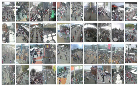 - WorldExpo [44]: This dataset is used for cross scene crowd management scenarios. The dataset consists of 3980 frames having size . The total number of labeled pedestrians is 199,923. The authors in WorldExpo dataset perform data drive cross scene counting in a crowded scene. All videos are collected through 108 cameras which are installed for surveillance applications. Diversity is ensured in the scenes as videos are collected from cameras with disjoint bird views. The training set consists of 1127 1-min long videos from 103 scenes and testing set consists of five 1-h videos which are collected from five different scenes. Due to limited data, the dataset is not sufficient for evaluating approaches designed for dense crowded scenes.