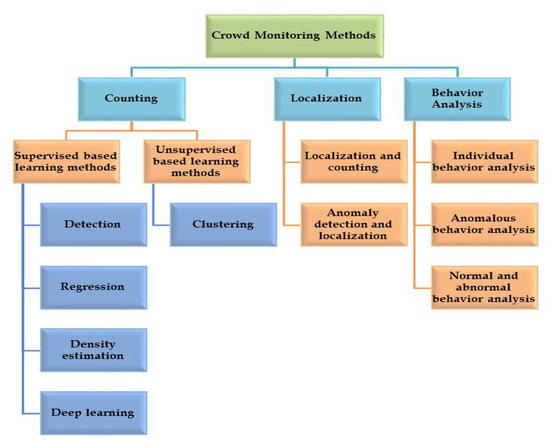 Gathering of people for some specific reason such as political gathering, religious occasion, and sports event is called crowd. Estimating the number of people in videos or images is called crowd counting. We divide crowd counting into two types, known as supervised and unsupervised counting. In the first type of counting, the input data are normally labeled and then some machine learning tool is used for prediction. In unsupervised crowd counting, the data and labels are unknown. A machine learning tool is used for categorization. These two categories are further divided into other types as shown in Figure 5. The supervised crowd counting is further divided into the following types: