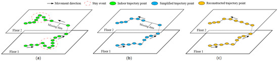A reconstructed trajectory,, reconstructs the missing data in the simplified trajectory. As shown in Figure 1c,is the recording time of the reconstructed point,is the coordinate information of the user at time, andis the floor on which the user is located.