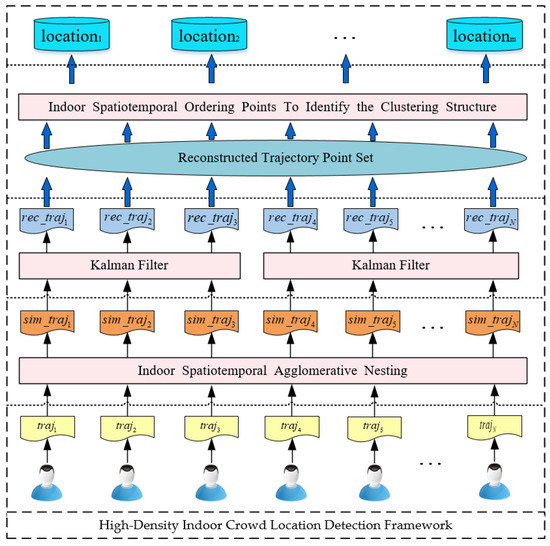 Accurate detection of locations of indoor high-density crowds is crucial for early warning and emergency rescue during indoor safety accidents. The spatial structure of indoor environments is more complicated than outdoor environments. The locations of indoor high-density crowds are more likely to be the sites of security accidents. Existing detection methods for high-density crowd locations mostly focus on outdoor environments, and relatively few detection methods exist for indoor environments. This study proposes a novel detection framework for high-density indoor crowd locations termed IndoorSRC (Simplification–Reconstruction–Cluster). In this paper, a novel indoor spatiotemporal clustering algorithm called Indoor-STAGNES is proposed to detect the indoor trajectory stay points to simplify indoor movement trajectory. Then, we propose use of a Kalman filter algorithm to reconstruct the indoor trajectory and properly align and resample the data. Finally, an indoor spatiotemporal density clustering algorithm called Indoor-STOPTICS is proposed to detect the locations of high-density crowds in the indoor environment from the reconstructed trajectory. Extensive experiments were conducted using indoor Wi-Fi positioning datasets collected from a shopping mall. The results show that the IndoorSRC framework evidently outperforms the existing baseline method in terms of detection performance.