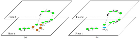A simplified trajectory,, simplifies the trajectory points caused by the stay event in the indoor trajectory. As shown in Figure 1b,is obtained by simplifying the points that are continuous in time and close to each other, whereis the average time of the simplified points,is the center coordinate of the simplified points, andis the floor on which the user is located.