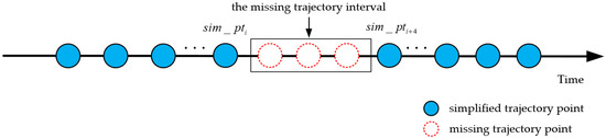 - Identification of the missing trajectory points: The number of missing trajectory points in the simplified trajectory are determined according to the sampling interval of the simplified trajectory. As shown in Figure 4, the trajectory interval with a sampling interval that exceeds twice the average sampling interval in the simplified trajectory is regarded as the missing trajectory interval. When the sampling interval of the missing trajectory interval is less than the 95th percentile of the sampling interval, the missing trajectory points need to be reconstructed. The calculation method of the number and time information of the missing trajectory points are shown in Equations (4) and (5):where represents the sampling interval of the missing trajectory interval, represents the average sampling interval of the simplified trajectory points, represents the downward rounding function, represents the number of missing trajectory points, and represents the time information of the -th missing trajectory point in the missing trajectory interval (for example, represents the time information of the first missing trajectory point in the missing trajectory interval).