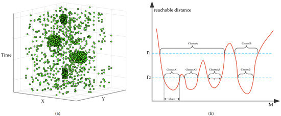 - When the spatial radius of the Indoor-STOPTICS algorithm is , the trajectory points included in each cluster can be obtained by the corresponding horizontal axis index sequence. For example, the horizontal axis index sequence corresponding to is and the trajectory points included in can be expressed as .