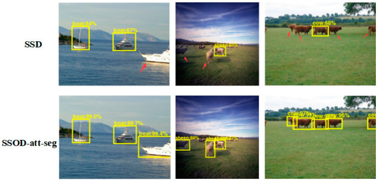 Comparison of detection effects between the SSOD-att-seg algorithm and SSD algorithm. The arrows indicate the objects detected by the SSOD-att-seg algorithm but missed by the SSD algorithm.