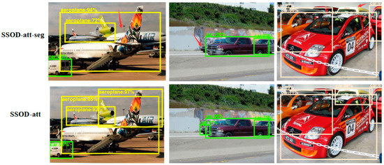 By analyzing the detection accuracy of each category of the SSOD-att algorithm, it can be found that the detection accuracy of the SSOD-att algorithm is greatly improved for boats, potted plants, aeroplanes, and other objects that are easy to be partially blocked in pictures. Figure 6 shows the comparison of the detection results of the SSOD-att algorithm and SSOD-att-seg algorithm.