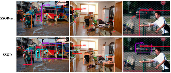 By observing the pictures detected by the algorithm, it is also found that the SSOD-att algorithm is not accurate enough to detect objects, which is caused by the complex background at home, and the complex background may cause the false detection of the algorithm. Figure 7 shows the comparison of the detection results of the SSOD algorithm and the SSOD-att algorithm. The detection confidence of SSOD is higher and there are fewer undetected objects. The experiments proved that the SSOD algorithm can well alleviate the false detection problem caused by the interference of the cluttered background in the images.