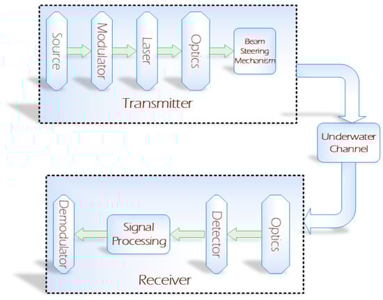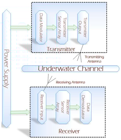 In recent years, the inclination towards optical and magnetic tracking-based wireless communication has increased in the fields of terrestrial, underwater, and space links due to its low power and provision of high data rates [1,2]. Considerable research has been carried out for space and terrestrial links, but less emphasis has been placed on underwater communication as it is a more tedious and challenging job compared to atmospheric links of communication [3]. For efficient underwater communication, there are a certain number of issues. The major issue is the type of underwater environmental conditions, which range from shallow coastal water to deep-sea or oceans [3]. Acoustic waves are commonly used for underwater communication whose performance is degraded by high losses in transmission and reception of signals, low bandwidth, high latency, and Doppler spread. All these drawbacks can cause temporal and spatial variation of the acoustic channel, which further limits the available bandwidth of the system [4]. According to the real-time water communication data, the current underwater acoustic communication can support up to tens of kbps of data rate for long distances (in km) and up to some hundreds of kbps standard for short-range (few meters) [5,6]. Acoustic communication is categorized in different links. Table 1 provides the typical bandwidth for different underwater acoustic communication links with various ranges [7].