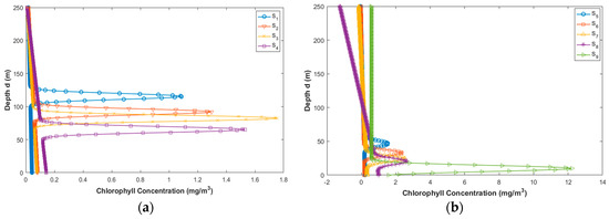 (a) Chlorophyll concentration depth profile different ranges of surface chlorophyll level S1–S4 [27]; (b) chlorophyll concentration depth profile for different ranges of surface chlorophyll level S5–S9 [27].