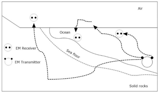 It can be observed that the propagation velocity of the electromagnetic wave of 10 MHz frequency underwater is increased 100 times that of the acoustic tracking system. This is an important ingredient to control the latency. The impact of change in frequency on wavelength can also be observed in Table 4. As the frequency increases in seawater, the wavelength decreases in magnitude. This effect can help in the implementation of the navigational and sensing applications. It is also an interesting fact that electromagnetic waves get attenuated more in water than air due to which localized communication becomes easier in a multiuser environment. The effect of water to air interface is also an important consideration in electromagnetic tracking performance. Due to specific refraction loss and propagation loss, the electromagnetic wave crosses the water-to-air boundary and radiates from the small section of water directly above the transmitting end. Due to high permittivity and large refraction angle the signal travels almost parallel to the surface of the seawater. This phenomenon eliminates the need for surface repeater buoys in case of communication between land and a submerged station or a submarine. These all factors can enable multipath propagation of electromagnetic waves as shown in Figure 6 [40]. Table 5 represents the different data rates and applications of electromagnetic waves in water.