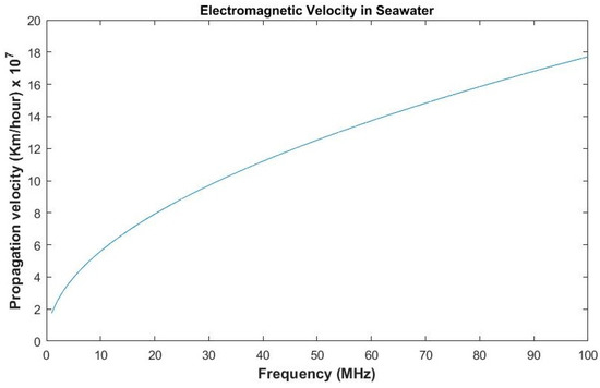 The propagation velocity of electromagnetic waves in seawater is frequency-dependent. It increases as the frequency value of electromagnetic waves is increased. Its value is approximated as given by Equation (10) [40]: