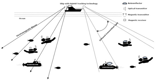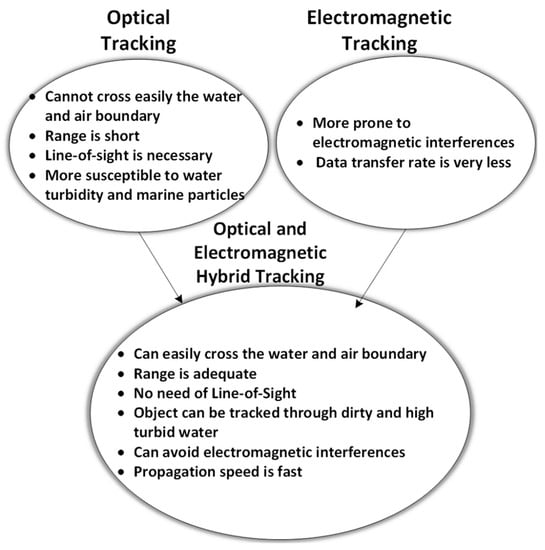 There may be a lesser need for LOS in electromagnetic-based communication depending on the amount of obstruction present in the seawater. Moreover, there is no effect of scattering, sunlight, and much less effect of dispersion in electromagnetic waves as compared to optical-based tracking. On the other hand, optical technology needs LOS for communication. It is also affected by dispersion, scattering, and sunlight interference. However, its bit rate is much more than electromagnetic-based communication. Moreover, low power is required in optical communication. Therefore, taking advantage of both technologies, the hybrid version of both optical and electromagnetic tracking based wireless communication is discussed for aquatic communication. Figure 9 shows the features of the hybrid diver-tracking system.