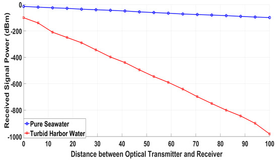 The parameters in Table 7 are the general parameters in which the performance of an optical tracker is best. The transmitting power is generally chosen between 10 to 100 milliwatt for a tracking range of 100 m [8]. Divergence angle is typically less than [31]. Transmitting and receiver efficiency lies between 0.4 and 0.9. Aperture area of the receiver is between 10 cm2 to 100 cm2 for optimum performance. The data rate is affected by aperture area of the receiver, optical depth range, and operating wavelength. Substituting the values of parameters given in Table 7 in the general equation of received power, Equation (4), for simulating the results. Figure 10 shows the simulation results of the optical tracker with different distances between diver and retroreflector in pure seawater and turbid harbor water.