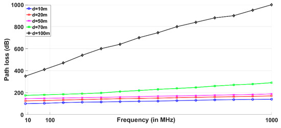 where is electric conductivity, is magnetic permeability and is dielectric permittivity. The rate of communication is high in the freshwater as the absorption coefficient is not dependent on frequency. It can be noticed in Equation (6) that the absorption coefficient will almost be the constant value. Therefore, electromagnetic tracking-based communication is more efficient in freshwater as compared to seawater.