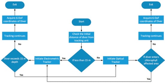 The acquisition of 6-Degrees of Freedom (6-DoF) coordinates, that are X, Y, Z, Yaw, Pitch and Roll of the diver can be achieved through the hybrid tracking system by initiating it in the switching mode. The flowchart shown in Figure 12 describes the possible working of the hybrid diver-tracking system.