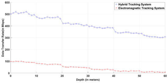 Figure 14 represents the data rate of the electromagnetic tracker and hybrid tracker. The data rate decreases in the case of both electromagnetic tracker and hybrid tracker as the depth of the seawater increases due to turbidity and dirt in the seawater. However, the decrease in data transfer rate is significantly less in the case of a hybrid tracking system as compared to the electromagnetic tracking system alone. The data rate shown in Figure 14 is simulated using Equations (15) and (16).