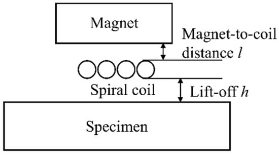 Electromagnetic acoustic transducers (EMATs) are widely used in many industries. Like an eddy current sensor, which can provide abundant information [1,2,3,4,5], an EMAT can also be used to evaluate the property of materials and detect defects. Compared with piezoelectric transducers, EMATs can generate various modes of ultrasonic waves at the surface of the specimen without a couplant for a wholly different mechanism. However, the conversion efficiency is relatively low [6,7,8,9,10]. Previous research mainly focused on how to enhance the conversion efficiency, and the researchers achieved this goal by optimizing the magnet, coil, back-plate configuration, and so on [11,12,13]. In fact, not only the conversion efficiency but also the lift-off effect hinders the development of EMATs. Lift-off has a significant impact on the amplitude of the receiving signal of EMATs. A slight increase in the lift-off will cause obvious signal attenuation [14,15,16]. Therefore, in some specific work environments, for example, involving irregular sample surfaces, online inspection, and uneven coating, the signals are quite weak [17,18]. Weakening the lift-off effect can effectively improve this situation. However, studies on how to reduce the lift-off effect of EMATs are rarely reported.