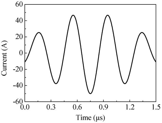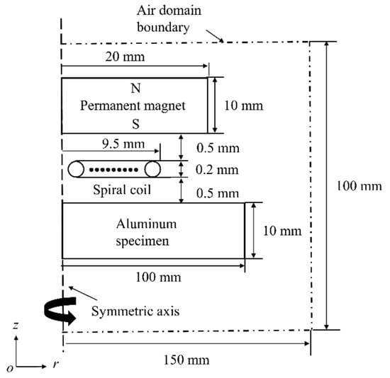 Optimizing structural parameters is one of the ways to improve conversion efficiency. Previous research has conducted detailed studies on the size of the magnet, as well as the size and shape of the coil and back-plate [11,12,13]. However, there exist few reports on the effect of magnet-to-coil distance on conversion efficiency. The magnet-to-coil distance will affect the magnetic flux density and the induced eddy current density at the specimen surface. Obviously, the magnetic flux density will decrease as the magnet-to-coil distance increases. As for induced eddy current density, when the magnet-to-coil distance increases, the induced eddy current density at the magnet surface will decrease. Correspondingly, the induced eddy current density at the specimen surface will increase. This is because the energy of the electrical signal I transfers to the specimen surface and the magnet surface near the coil. The key research question is whether the enhancement of induced eddy current density outweighs the loss in magnetic flux density. To solve this problem, a 2-D finite element model was developed. Due to the symmetries of this EMAT, a 2-D axis-symmetric model was utilized to calculate the numerical results. As shown in Figure 2, the oz axis is the symmetric axis, and the radius and the height of the permanent magnet are 20 mm and 10 mm, respectively. The radius and the height of the aluminum specimen are 100 mm and 10 mm, respectively. In addition, the EMAT is surrounded by air domain boundaries. Table 1 shows the basic parameters for a finite element model. The excitation current is shown in Figure 3. The peak of the excitation current is 50 A with a time range of 0–1.5 μs. The model was solved by COMSOL Multiphysics 5.2 (COMSOL Inc., Burlington, MA, USA). The AC/DC and Magnetic Field module was used for producing Lorentz force, and Structural Mechanics was used for the generation and transmission of shear waves.