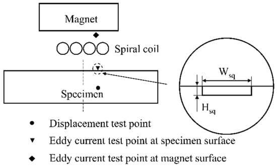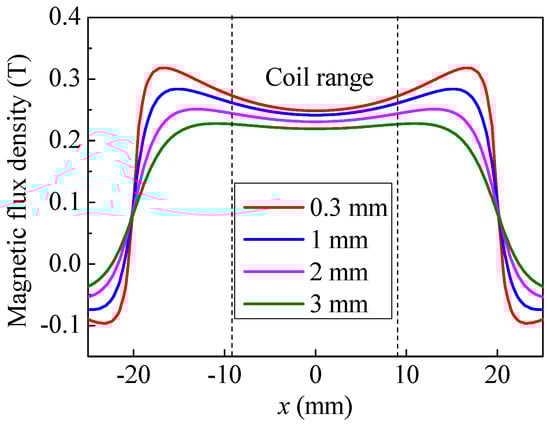 Figure 4 shows the magnetic flux density at the specimen surface. In Figure 4, the magnetic flux density distribution has a flat arched curve at the center, and the magnetic flux density is slightly larger towards the edges of the magnet. If the magnet-to-coil distance increases, the magnet-to-specimen distance will increase as well. When the magnet-to-coil distance is increased from 0.3 mm to 3 mm, the maximum attenuation of magnetic flux density at the edge of the coil is 21.1% while the minimum attenuation at the center of coil is 13.3%. In addition, if the magnet-to-coil distance is increased from 1 mm to 2 mm, and 2 mm to 3 mm, the maximum attenuation is 7.33% and 4.99%, respectively. Therefore, the attenuation trend of magnetic flux density becomes more obvious as the magnet-to-coil distance increases.