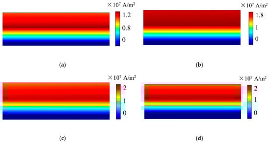 The eddy current distribution in the specimen at 8 μs generated by the EMAT with a magnet-to-coil distance of (a) 0.3 mm, (b) 1 mm, (c) 2 mm, and (d) 3 mm.