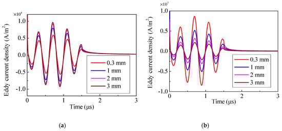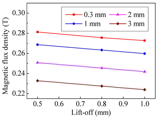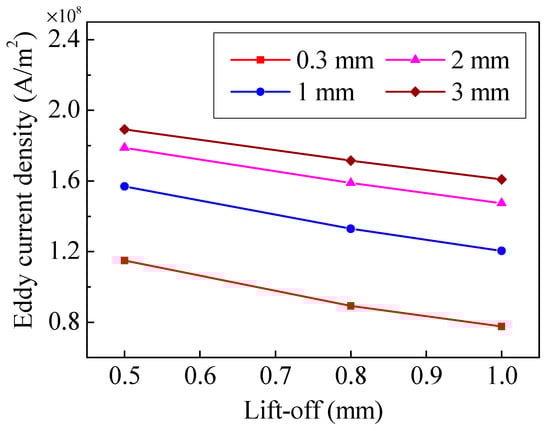 Obviously, as one of the main factors that can directly affect the amplitude of ultrasonic waves, the distribution of Lorentz force at the specimen is sensitive to lift-off. To conduct an in-depth study on the effect of magnet-to-coil distance on lift-off effect, the effect of lift-off on magnetic flux density and eddy current density were investigated. Figure 10 shows the relationship between lift-off and magnetic flux density at the edge of the coil. It can be observed that the magnetic flux density is related to the lift-off. The magnetic flux density decreases with increase of lift-off. In the previous section, it was concluded that the attenuation trend of magnetic flux density becomes more obvious with a greater magnetic-to-coil distance. However, the biggest distance difference in lift-offs is only 0.5 mm in Figure 10, which leads to almost the same attenuation trend of magnetic flux density. On the other hand, the eddy current density decreases with lift-off as well, which is shown in Figure 11. In Figure 11, it is obvious that a greater lift-off means a slower decay rate in eddy current density. When the magnet-to-coil distance is 0.3 mm, if the lift-off is increased from 0.5 mm to 1 mm, the decay rate of the eddy current density is 35.2%. Once the magnet-to-coil distance is 2 mm and 3 mm, the decay rate of the eddy current density drops to 17.4% and 15.3%, respectively. Therefore, increasing the magnet-to-coil distance can limit the eddy current density attenuation.