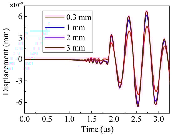 Based on the trends of the magnetic flux density and eddy current density, it is reasonable to assume that the amplitude of the shear waves generated by the EMAT will increase first and then decrease slowly as the magnet-to-coil distance increases. The waveforms at the displacement test point in Figure 8 confirm this hypothesis. Note that the curves of 2 mm and 3 mm almost overlap in Figure 8. To conveniently contrast the amplitude of the shear wave, the peak-to-peak amplitude of the waves is plotted in Figure 9. The conversion efficiency in the EMAT with a magnet-to-coil distance of 2 mm is about 1.4 times as high as that in the EMAT with a magnet-to-coil distance of 0.3 mm. That is, increasing the magnet-to-coil distance can significantly enhance the conversion efficiency of EMAT; however, when the magnet-to-coil distance reaches 2 mm, the amplitude of the shear wave starts to decrease slowly. Therefore, the magnet-to-coil distance should be 2 mm to get the best conversion efficiency.
