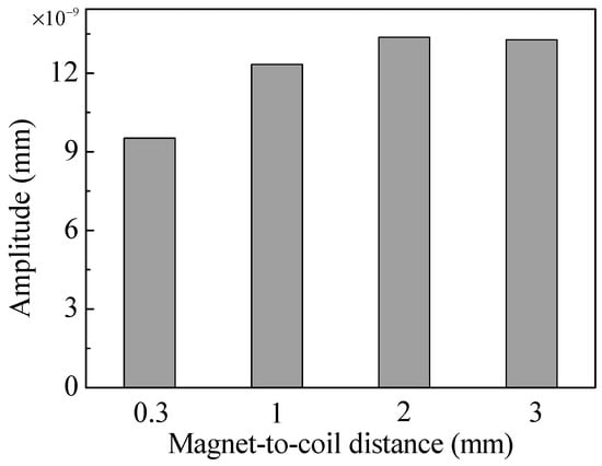 For an EMAT, a good lift-off performance and high conversion efficiency are indispensable. This implies that the position of the fitting line of an excellent EMAT should be as high as possible in Figure 13. Meanwhile, the trend of the fitting line should be as smooth as possible. The above requirements can be achieved by appropriately increasing the magnet-to-coil distance. When the magnet-to-coil distance is 2 mm, the lift-off performance is increased by 46.6%. Incidentally, the conversion efficiency is increased by 40.5% and 71.0% with a lift-off of 0.5 mm and 1 mm, respectively.