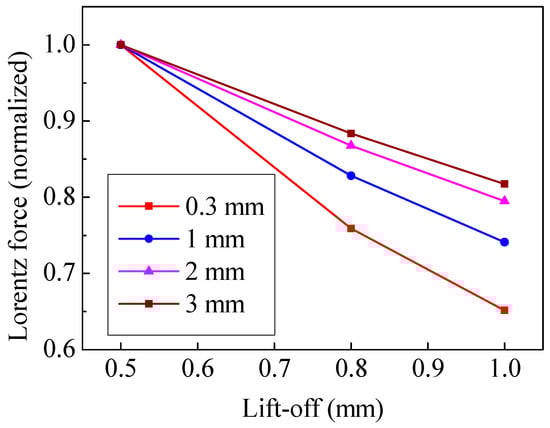 The Lorentz force is determined by the magnetic flux density and the eddy current density at the specimen surface. Therefore, the trend of Lorentz force is similar to that of the eddy current density, as shown in Figure 12. It can be seen that increasing the magnet-to-coil distance is conducive to a slower decay rate of the Lorentz force. The relationship between lift-off and ln(As) is shown in Figure 13. The slope of the fitting lines in Figure 13 indicates that a larger magnet-to-coil distance means better lift-off performance. Table 2 shows the k value and correlation coefficient of different EMATs. It can be observed that when the magnet-to-coil distance is increased from 0.3 mm to 2 mm, the lift-off performance is increased by 46.6%. However, when the magnet-to-coil distance is increased from 2 mm to 3 mm, the lift-off performance is only increased by 12.2%. Therefore, the promotion of lift-off performance is diminishing as the magnet-to-coil distance increases, which demonstrates that the ability to improve the lift-off performance by increasing the magnet-to-coil distance is limited. In addition, the correlation coefficients in Table 2 are quite close to −1, which indicates that the simulation results are reliable. All in all, increasing the magnet-to-coil distance can weaken the lift-off effect.