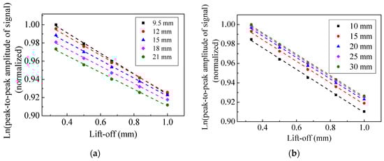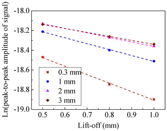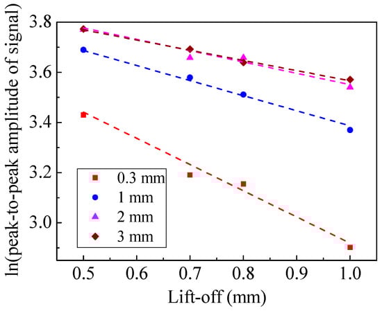 The amplitude will reduce exponentially when the lift-off increases, which was confirmed in the research by Ogi et al. and Thompson [15,24]. Hence, the relationship between lift-off and signal amplitude can be expressed as