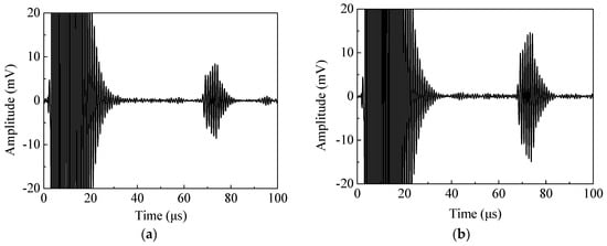 Figure 16 shows the measured shear waveforms with different magnet-to-coil distances when the lift-off was 1 mm. The amplitude peak in Figure 16b is obviously larger than that of Figure 16a. The generation efficiency of the EMAT was increased by 67.5%. This value is close to the numerical simulation results, showing a significant improvement in the generation efficiency of an EMAT with a suitable magnet-to-coil distance. In addition, the effect of magnet-to-coil distance on performance of EMAT is shown in Figure 17. In Figure 17, it can be observed that a suitable magnet-to-coil distance can significantly enhance the conversion efficiency and the lift-off performance at the same time. This means that increasing the magnet-to-coil distance appropriately can enhance the eddy current density at the specimen surface and limit the eddy current density attenuation with increasing lift-off.