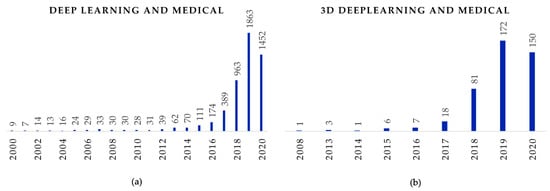Historical methods for automated classification of images involves extensive rule-based algorithms or manual feature handcrafting [,,,,,], which are time-consuming, have poor generalization capacity and require domain knowledge. All this changed with the advent and demonstrated the success of CNNs. CNNs are devoid of any manual feature handcrafting, require little preprocessing and are translation-invariant []. In CNNs, low-level image features are extracted by the initial layers of filters and progressively higher features are learnt by successive layers before classification. The commonly seen X-ray is an example of a two-dimensional (2D) medical image. The machine learning of these medical images is no different from CNNs applied to classify natural images in recent years, e.g., the ImageNet Large Scale Visual Recognition Competition []. With decreasing computational costs and powerful graphics processing (units (GPUs) available, it has become possible to analyze three-dimensional (3D) medical images, such as CT, DTI, fMRI, Ultrasound and MRI scans [] using 3D deep learning. These scans give detailed three-dimensional images of human organs and can be used to detect infection, cancers, traumatic injuries and abnormalities in blood vessels and organs. The major drawback in the application of 3D deep learning on medical images is the limited availability of data and high computational cost. Further, there is a problem of the curse of dimensionality. However, with the recent advancements in neural network architectures, data augmentation techniques and high-end GPUs, it is becoming possible to analyze the volumetric medical data using 3D deep learning. Consequently, since 2012, we have seen exponential growth in the applications of 3D deep learning in different medical image modalities. Here, we present a systematic review of the applications of 3D deep learning in medical imaging with possible future directions. To the best of our knowledge, this is the first review paper of 3D deep learning on medical images.