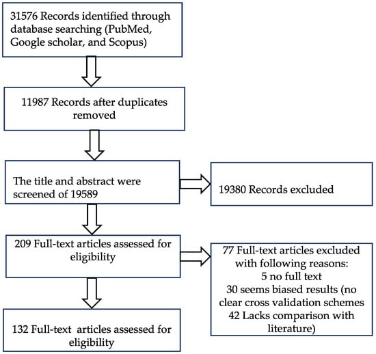 In this systematic review, we searched for the applications of 3D deep learning in medical image segmentation, classification, detection and localization. For the literature search, we chose three database platforms, namely Google Scholar, PubMed and Scopus. The application of 3D CNN effectively came into the picture after the remarkable success of AlexNet in 2012, which was enabled by advanced parallel computing architecture. Between 2015 and 2016, we have seen exponential growth in the literature related to 3D deep learning in medical imaging, and therefore, we limited our search to after 1 January 2012. The first search was performed on 12 September 2019, and the second search on 1 January 2020, while the third search was performed on 1 July 2020. The literature search and selection for the study were done according to the preferred reporting items for systematic seviews and meta-analyses (PRISMA) statement []. We searched for title and abstract with different keyword combination of “3D CNN”, “medical imaging”, “classification”, “segmentation”, “detection” and “localization” and selected 31,576 records. 11,987 duplicate records were removed. After studying the title and abstract, we further removed 19,380 records. We further excluded 77 records. Finally, we collected 132 papers for our review purpose. The details about the inclusion and exclusion of papers according to the PRISMA statement is depicted in Figure 2.