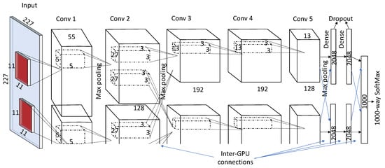 Several different versions of CNN have been proposed in the literature to improve model performance. In 2011, Krizhevsky et al. [] presented a deep CNN architecture. A systematic architecture of AlexNet is shown in Figure 4. AlexNet has five convolutional layers and three fully connected layers (the last FC layer was the SoftMax layer). The network was trained on 1.2 million images with 60 million parameters. To tackle these large parameters, AlexNet was trained on a multi-GPU (2-GPUs, 3GB GTX-580) environment by systematically distributing the neurons on both the GPUs. Data augmentation and dropouts were used to avoid overfitting. Data augmentation was done in two ways: (1) image translations and horizontal reflections, and (2) changing the intensity of RGB channels. The AlexNet architecture has won ILSVRC-2012 (ImageNet Large Scale Visual Recognition Competition-2012) with a large margin. The difference between the top-five test errors of AlexNet (15.3%) and the second prize winner (26.2%) was around 10%.