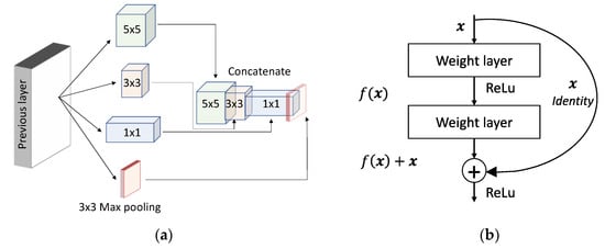 In 2014, Simonyan and Zisserman [] presented a more profound deep network architecture called VGGNet (Visual Geometry Group Network) (16 layers and 19 layers) for the ImageNet Challenge 2014 and secured the first position for the localization task and the second position for the classification task. VGGNet uses 3 × 3 filters for convolutional layers and three consecutive fully connected layers 4096, 4096, and 1000 in size, respectively. The design of VGGNet is quite similar to AlexNet. Adding consecutive layers to the network increases the number of parameters that cause networks to suffer from errors and overfitting. In supervising learning, the deeper network requires large data for training and despite the use of data augmentation techniques, it may happen that the data is not sufficient. Further, annotating such a large amount of data can be quite expensive. Furthermore, because a linear increase in the filter emerges as a result of a quadratic increase in computational burden, deeper networks lead us to a computational explosion. In deeper layers, weights can be near zero and emerge as a waste of computational resources. Fast forwarding from 2012, in 2014, the designers at Google presented the concept of “Inception” based on the Hebbian principle and the intuition of multiple-scale processing, and the network was called GoogLeNet (also known as Inception-V1) []. The intuition behind the inception module (version V1) (Figure 5a) is that the optimal neural network topology can be built by clustering neurons to the correlation statistics in the input images. The authors analyzed the correlation statistics in the activations in the previous layer and clustered the neurons with highly correlated outputs for the next layer. In the images, the correlation tends to be local, and therefore, performing convolutions over the local patches can cluster the neurons. In lower layers, there exists a high correlation between local pixels in a surrounding patch. These pixels can be covered by a small 1 × 1 convolution. Besides, the correlation between a smaller number of spatially spread-out clusters can be quantified by 3 × 3 and 5 × 5 convolutions. In order take effect of 1 × 1, 3 × 3 and 5 × 5, the authors stacked them as a single output vector for the next layer (Figure 5a). In addition, to take the advantages of maximum (max)-pooling, they also concatenated a pooling layer in parallel (3 × 3 max pooling branch in Figure 5a). The model size of GoogLeNet was 12 times less than AlexNet’s and required relatively net-lower memory and power than AlexNet. In addition, GoogLeNet’s computational cost was less than 2× that of AlexNet, while AlexNet was a network of eight layers and GoogLeNet was a network of 22 layers. Due to its high accuracy, fewer parameters and low power consumption, GoogLeNet was more suitable for mobile platforms. GoogLeNet has secured the first position in the ImageNet Large-Scale Visual Recognition Challenge 2014 (ILSVRC14). The concept of the inception module in GoogLeNet alleviates the problem of vanishing gradients and allows us to move deeper into the network. In the event of increasing computational complexity, the authors suggest reducing network dimensions by introducing Inception-V2 and Inception-V3. []. In inception-V2, inexpensive 1 × 1 convolution convolutions were inserted before the expensive 3 × 3 and 5 × 5 convolutions. In addition, in this module, the 1 × 1 convolution used ReLU activation. It was also suggested that the incorporation of inception layers would benefit if inserted in higher-order layers. Since the architecture of the GoogLeNet was rather deep, the designers were also concerned about the problem of gradient vanishing in the hidden layers during back-propagation. Since the intermediate layers in the network had a higher representation of the input image, they had more discriminative power. In Reference [], the authors presented the concept of Inception-V4 by appending the auxiliary classifiers to the intermediate layers. Since the FC connected layers were generally prone to error, in order to avoid overfitting, the authors replaced the FC layers with average pooling layers.