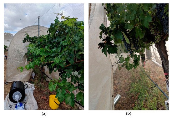 The smoke trial was conducted in late January-early February during the 2018/2019 growing season, at the University of Adelaide’s Waite Campus in Urrbrae, South Australia (34°58′ S, 138°38′ E). The trial, described previously by Szeto and colleagues [60], involved the application of smoke and/or in-canopy misting to Cabernet Sauvignon grapevines and comprised five different treatments: a control (C), i.e., neither misting nor smoke exposure; (ii) a control with misting (CM), i.e., in-canopy misting but no smoke exposure; (iii) a high-density smoke treatment (HS); (iv) a high-density smoke treatment with misting (HSM); and (v) a low-density smoke treatment without misting (LS). Treatments were applied to Cabernet Sauvignon grapevines planted in 1998 at 2.0 and 3.3 m vine and row spacings, and trained to a bilateral cordon, vertical shoot positioned trellis system (VSP), hand-pruned to a two-node spur system, with under vine drip irrigation (twice weekly, from fruit set to pre-harvest). Smoke treatments were applied (approximately seven days post-véraison, the period grapes are thought to be most susceptible to smoke contamination [10]) using a purpose-built smoke tent (Figure 1a,b) and experimental conditions reported previously [4,61]: low and high-density smoke treatments were achieved by burning different fuel loads (i.e., ~1.5 and 5 kg of barley straw, respectively). In-canopy misting was evaluated as a method for mitigating the uptake of smoke-derived volatile phenols by grapes and involved the continuous application of fine water droplets (65 µm) to the grapevine bunch zone using a purpose-built sprinkler system (delivering water at 11 L/h), as previously described [62]. Each treatment was applied to six vines from three adjacent panels, except the HS treatment, which comprised only five vines, with treatments separated by at least one buffer vine. LS, HS, and HSM treatments comprised duplicate applications of smoke to 1.5 panels/three vines at a time (except for one HS treatment). The in-canopy sprinkler system was turned on 5 min before the first HSM treatment was applied and off 15 min after the second HSM treatment was completed, such that CM and HSM grapevines were misted for approximately 2.5 h in total. The second and fifth vine from each treatment (the middle vines from smoke treatments) were then selected for physiological and NIR measurements.