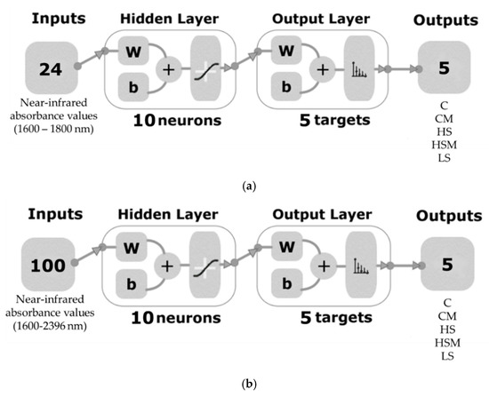 Two-layer feedforward network with ten hidden neurons and sigmoid function for the three classification models: (a). microPHAZIRTM leaf model (Model 1) and (b). microPHAZIRTM berry model (Model 2). Abbreviations: C = control without misting; CM = control with misting; HS = high density smoke without misting; HSM = high density smoke with misting; and LS = low density smoke.