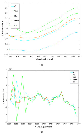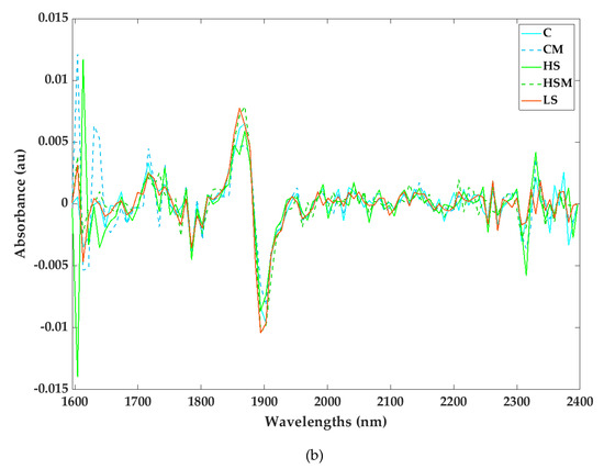Raw leaf absorbance (a) and second derivative spectra (b) measured with the microPHAZIRTM near-infrared (NIR) analyzer for the different smoke and misting treatments. Abbreviations: C = control without misting; CM = control with misting; HS = high density smoke without misting; HSM = high density smoke with misting; and LS = low density smoke.