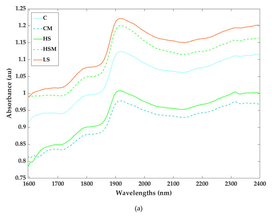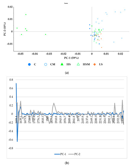 Principal component analysis (PCA) for the microPHAZIRTM berry absorbance values between 1600–2396 nm (a) and loadings (b). Abbreviations: C = control without misting; CM = control with misting; HS = high density smoke without misting; HSM = high density smoke with misting; and LS = low density smoke.