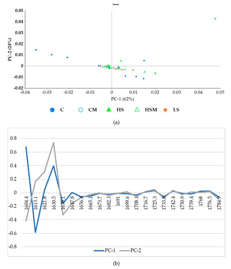 Principal component analysis (PCA) for the microPHAZIRTM leaf absorbance values between 1600–1800 nm (a) and loadings (b). Abbreviations: C = control without misting; CM = control with misting; HS = high density smoke without misting; HSM = high density smoke with misting; and LS = low density smoke.