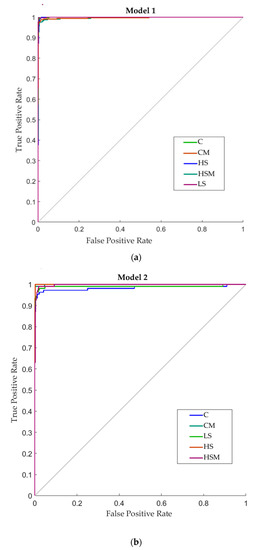 Figure 7 depicts the receiver operating characteristic (ROC) curves for the two ANN models developed. All models showed high true-positive rates (sensitivity) and low false-positive rates (specificity) for classifying the spectral readings according to the experimental treatment, which can also be observed in the last column of each confusion matrix. For Model 2, the HS treatment had the highest sensitivity (100%), followed by the CM and HSM treatments (99.1% each) and LS treatment (96.3%). The C treatment had the lowest sensitivity of 92.6% for this model. For Model 1, the C treatment had the highest sensitivity (99.1%), followed by the LS treatment (98.8%), HS treatment (97.8%), and CM treatment (97.5%), while the HSM had the lowest sensitivity of 96.9%.
