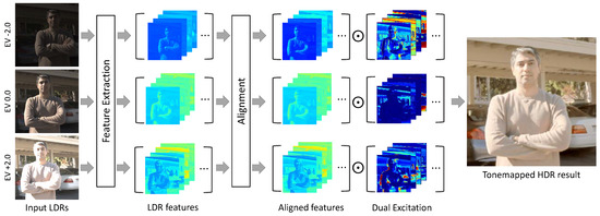 After aligning other features to the reference feature using the alignment network, we obtain the warped features . Despite the alignment process based on PIAM, the alignment error that PIAM cannot handle still exists. In order to eliminate the harmful effect of features in a region of misalignment or saturation, we designed a novel network that incorporates the dual excitation block (DEB) (Figure 5) and dilated residual dense block (DRDB) [21] during the merging process. Finally, the ghost-free HDR images are generated by reducing artifacts caused by misalignment and preserving details during the merging process.