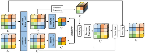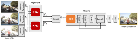 In contrast to other non-flow-based deep HDR methods [20,21], which only fuses misaligned features , , , we fuse warped features using the PIAM. As shown in Figure 5, the input of the DEB is a fusion of warped features and a reference feature. Feature fusion is defined as follows:
